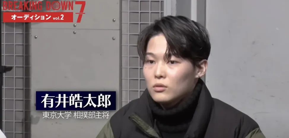 有井皓太郎さんはブレイキングダウン7のオーディションに出場した際、相撲部の主将をやっていたと宣言していましたが、実際は新歓担当(新人歓迎担当)だったようです。