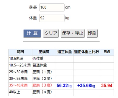 体重と身長で適正体重を調べたとことろ、適正体重よりも35.68Kgオーバーという結果でした。