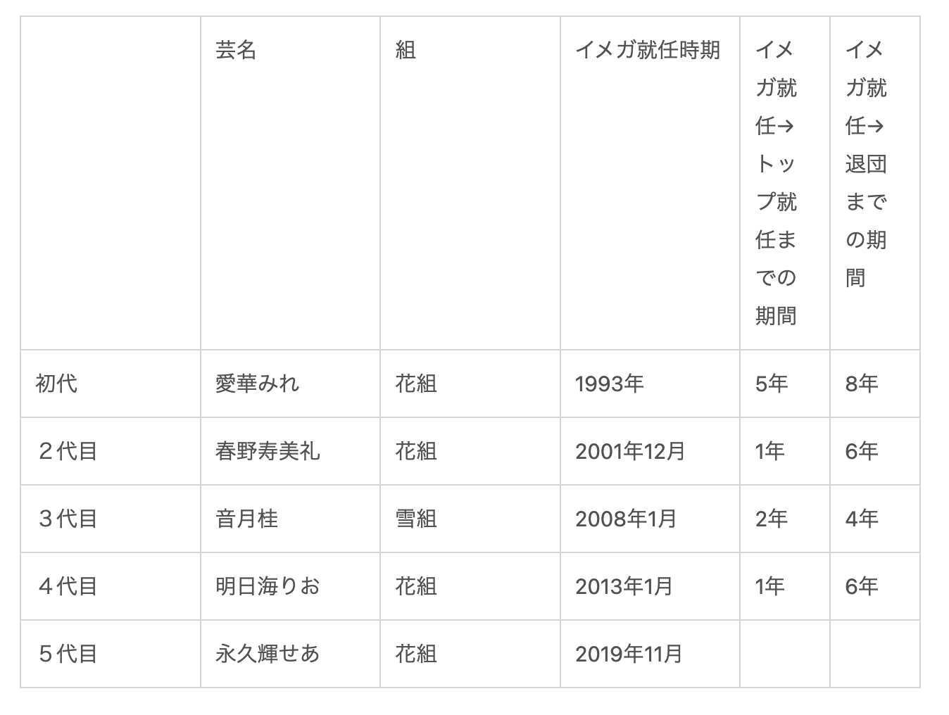 宝塚が100周年を迎えた(2014年)以降の、トップスター9人の任期の平均は5公演です。